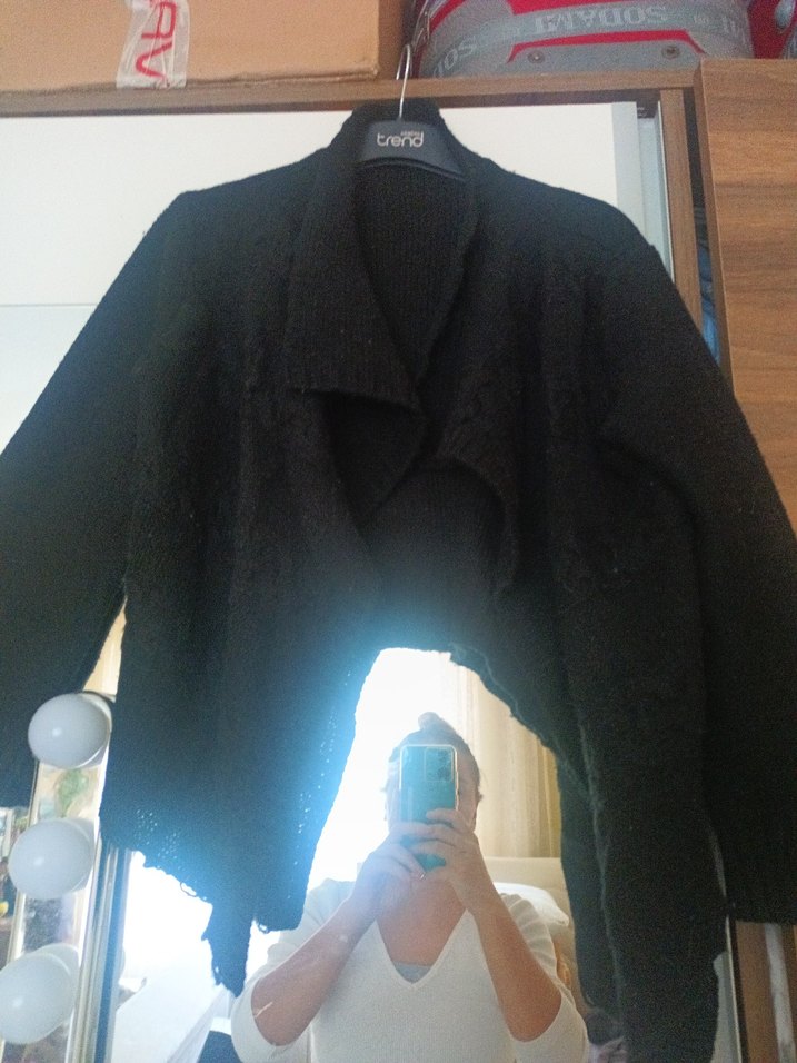 Siyah, yumuşak yün kumaştan, uzun kollu, dökümlü yakalı ve bol kesim kadın hırkadır. Günlük kullanıma uygun, rahat ve gotik tarzda bir parçadır.