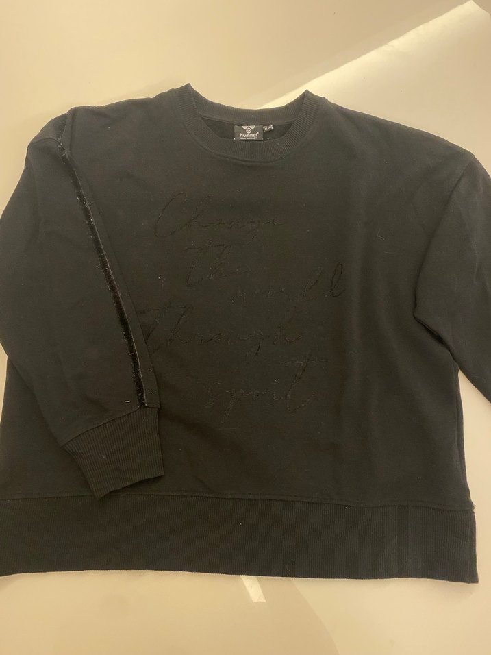 Siyah renkli, uzun kollu ve yuvarlak yakalı kadın sweatshirtü, kol üstü kadife şeritle hareketlendirilmiş bol kesimi ve yumuşak dokusuyla günlük kullanım için rahat ve şık bir seçimdir.