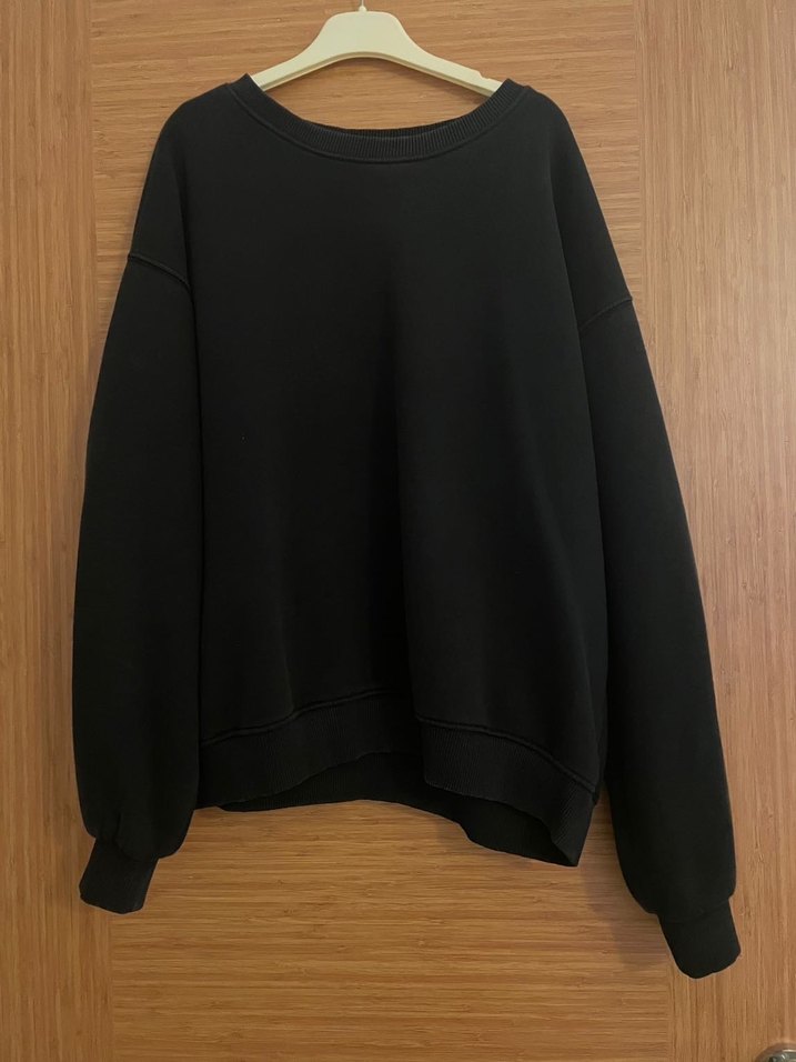 Siyah, yuvarlak yakalı ve uzun kollu bu kadın sweatshirtü, bol kesimiyle rahat bir kullanım sunar. Yumuşak ve sıcak kumaştan yapılmıştır, günlük kullanım için uygundur.