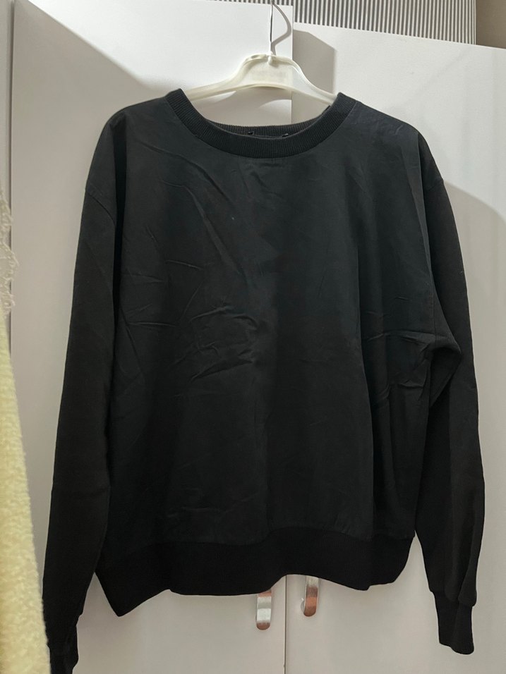Siyah renkli, bisiklet yaka ve uzun kollu bu sweatshirt, rahat oversize kesime ve normal boy uzunluğa sahiptir. Minimalist ve sade tasarımıyla günlük kullanıma uygundur.