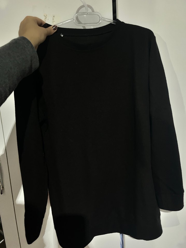 Siyah kadın sweatshirt, yuvarlak yaka ve uzun kollu, bol kesimdir. Yumuşak ve sıcak kumaştan, günlük ve sokak stili için rahat şıklık sunar.