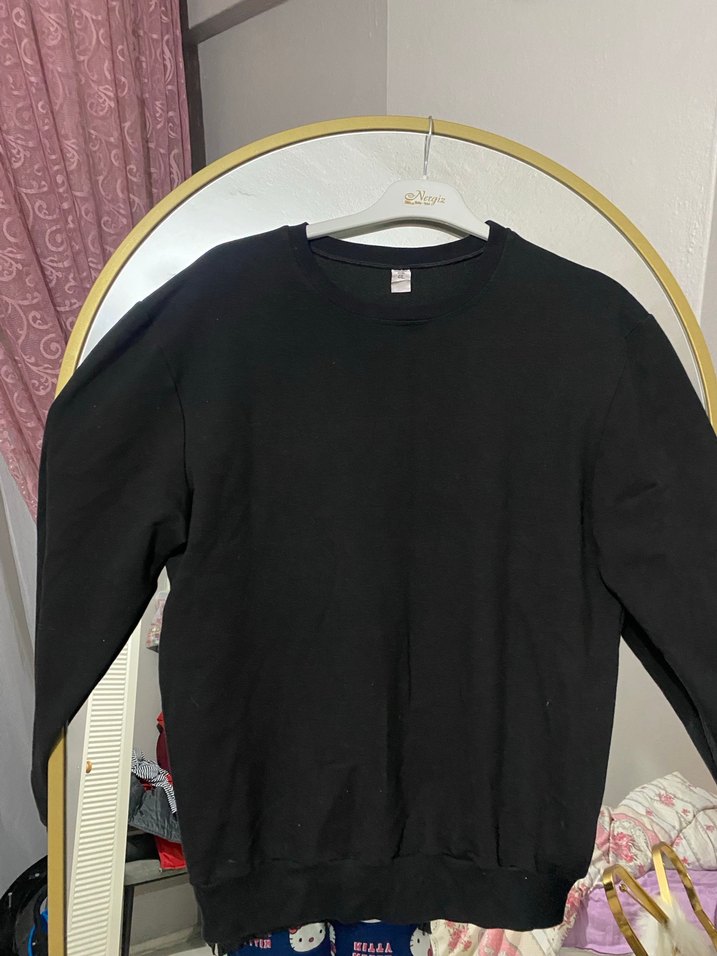 Siyah kadın sweatshirt, yuvarlak yaka ve uzun kollu, yumuşak ve sıcak kumaştan. Oversize kesim ve normal boyda, günlük rahat stil için uygun.