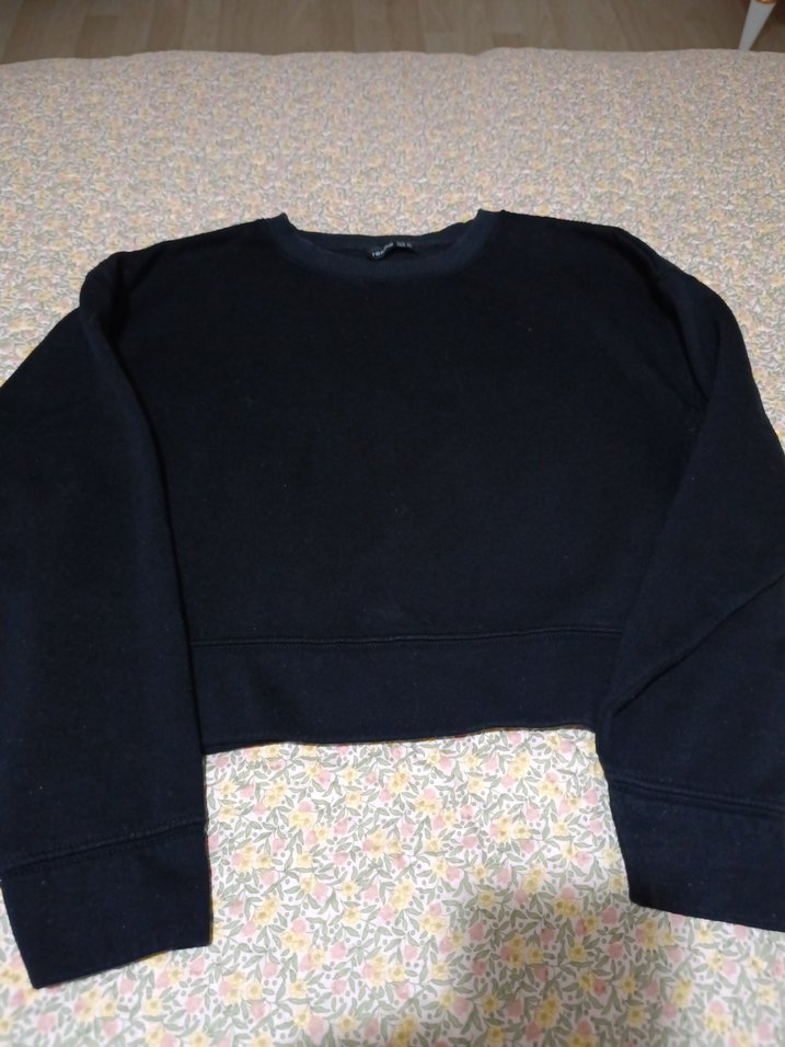 Pamuklu, uzun kollu, yuvarlak yakalı siyah kadın sweatshirtü, rahat ve bol kesim, günlük kullanım için ideal.