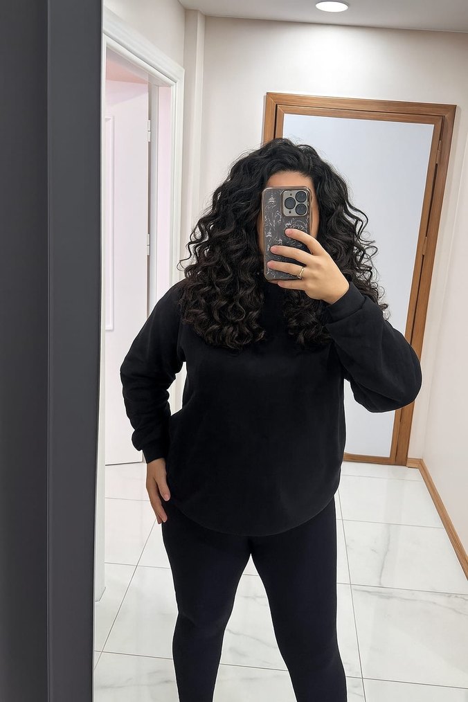 Siyah, uzun kollu ve yuvarlak yakalı bu kadın sweatshirtü, rahat kesimi ve orta boy uzunluğuyla günlük kullanıma uygundur. Yumuşak ve sıcak kumaştan üretilmiş, desensiz ve koyu renklidir.