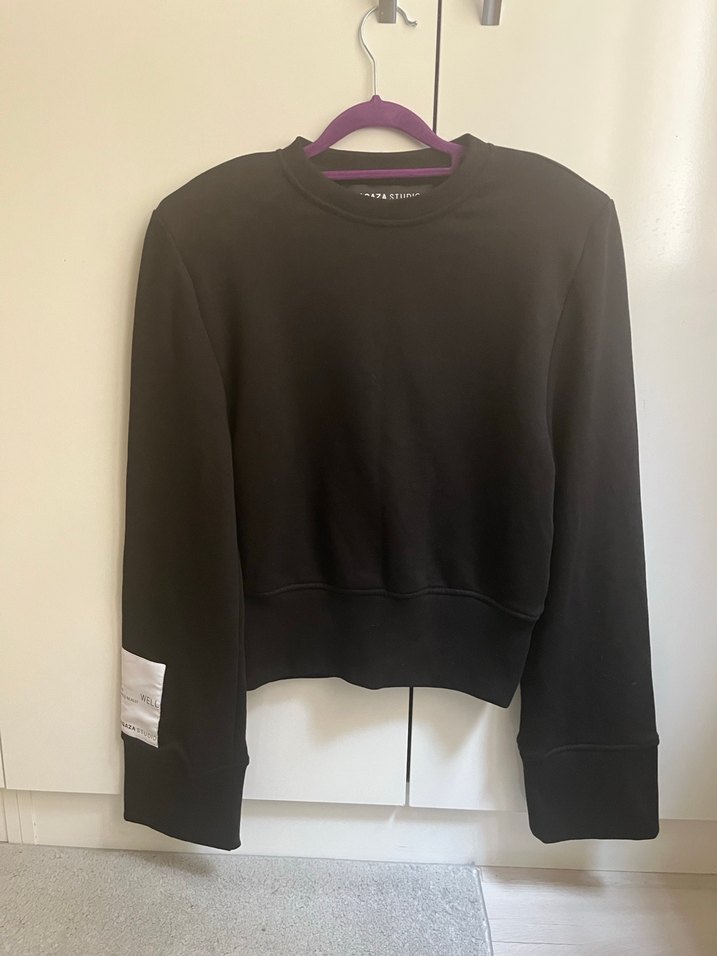 Siyah renkli, yuvarlak yakalı ve uzun kollu kadın sweatshirtü, rahat kesimi ve midi boyuyla dikkat çeker. Yumuşak ve sıcak dokusu günlük sokak stili için uygundur. Hiç kullanılmadı