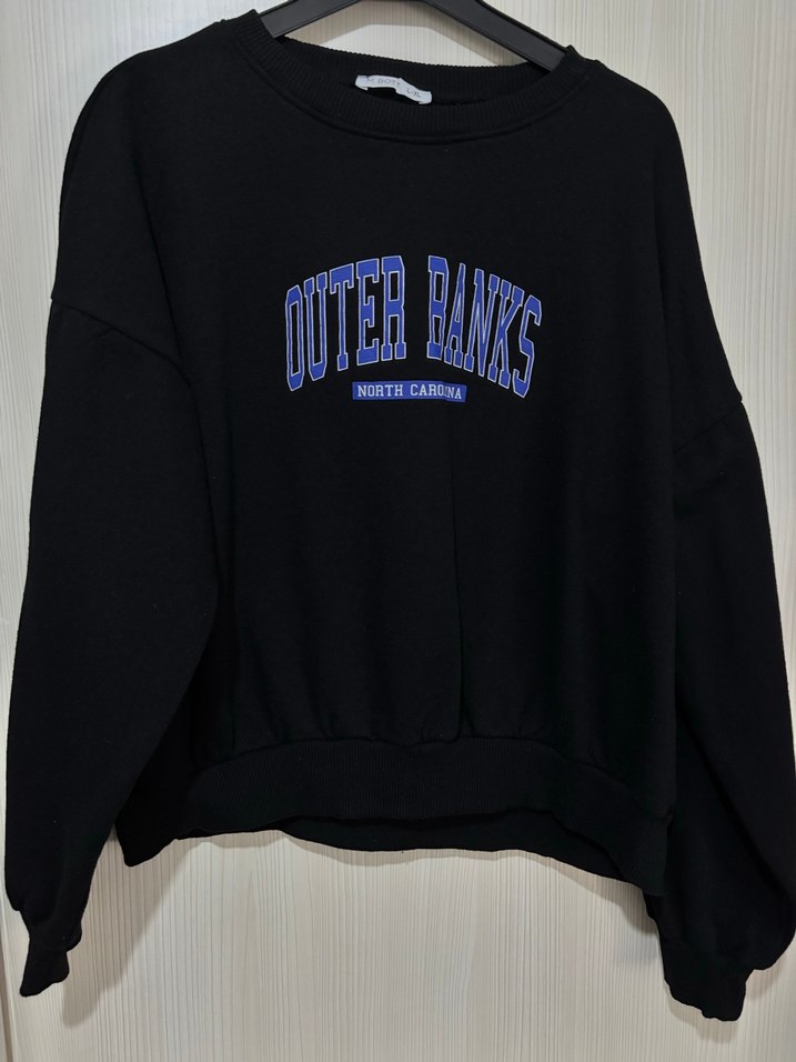 Siyah, oversize kesim, yuvarlak yaka ve uzun kollu sweatshirt. 'Outer Banks North Carolina' baskılı, yumuşak ve sıcak kumaştan, rahat dış mekan kullanımı için uygundur. L beden