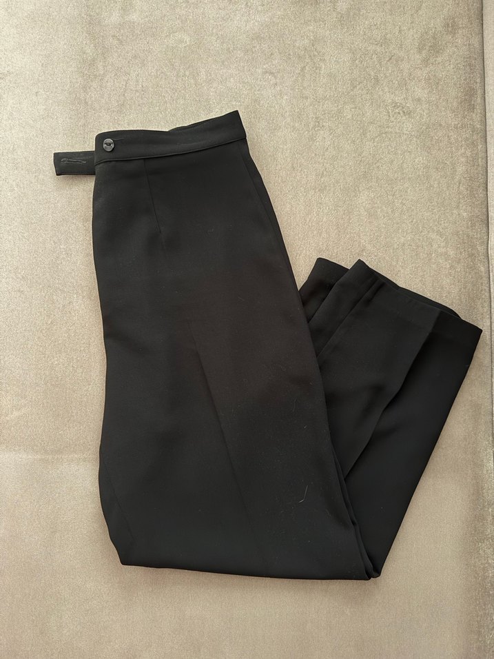 Kemerli ve midi boy siyah kadın kumaş pantolon, normal kesim ve ipeksi dokusuyla ofis için uygundur.