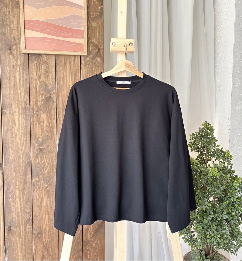 Kadınlar için pamuklu, uzun kollu, siyah renkli ve salaş kesim sweatshirt. Düz tasarımı günlük kullanımda zahmetsiz şıklık sunar.