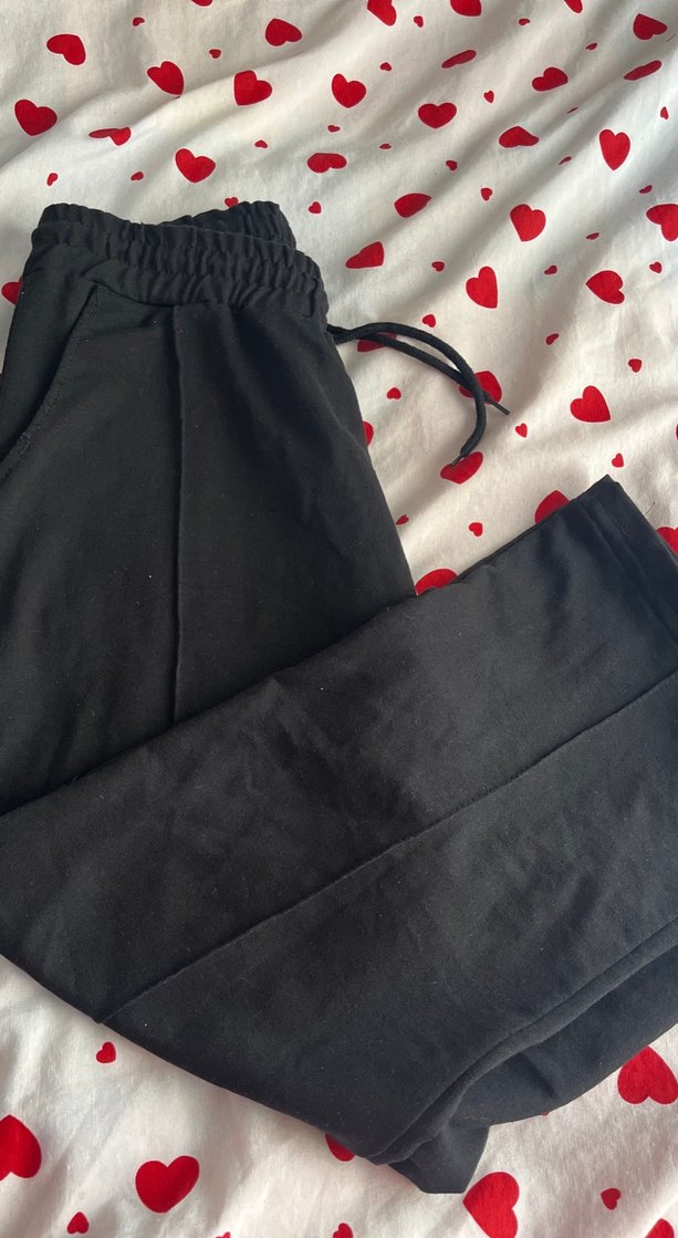 Siyah pamuklu, rahat kesim ve lastikli bel detaylı kadın eşofmanı. Günlük kullanıma uygun, konforlu ve sade tasarım.