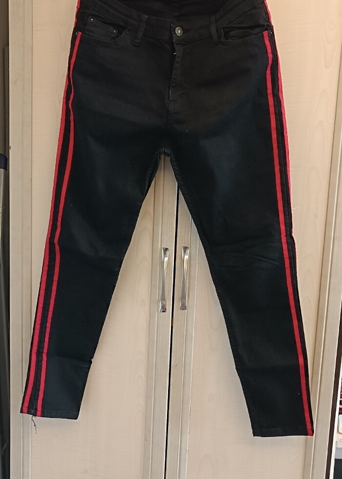 Kırmızı şerit detayları olan siyah pantolon hiçbir defosu yoktur