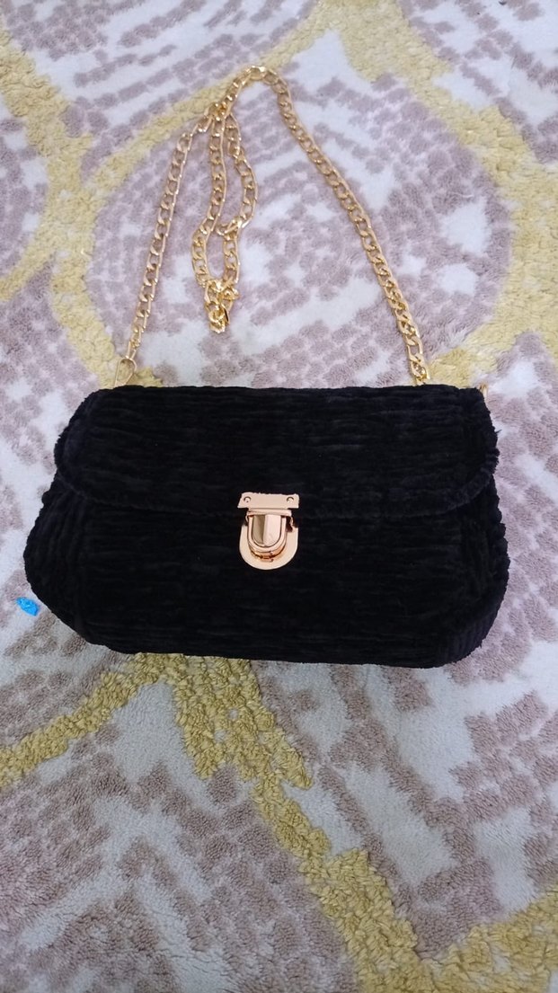 Kadınlar için yumuşak sentetik kumaştan, peluş detaylı, altın zincir askılı siyah renkte, desen içermeyen günlük ve sokak stiline uygun çanta. Altın renkli kilit sistemi bulunur.