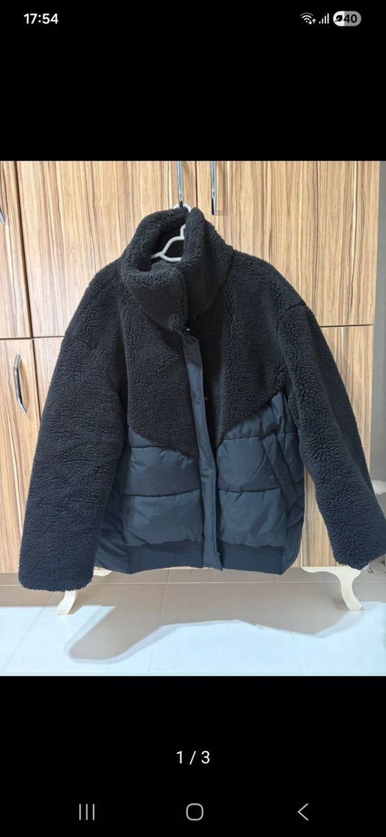 Yüksek yakalı, bol kesim siyah kadın kışlık ceket. Yumuşak kürk detayları ve kapitone bölümlerle sıcak ve rahat bir görünüm sunar. Midi boy ve uzun kolludur. ❄️