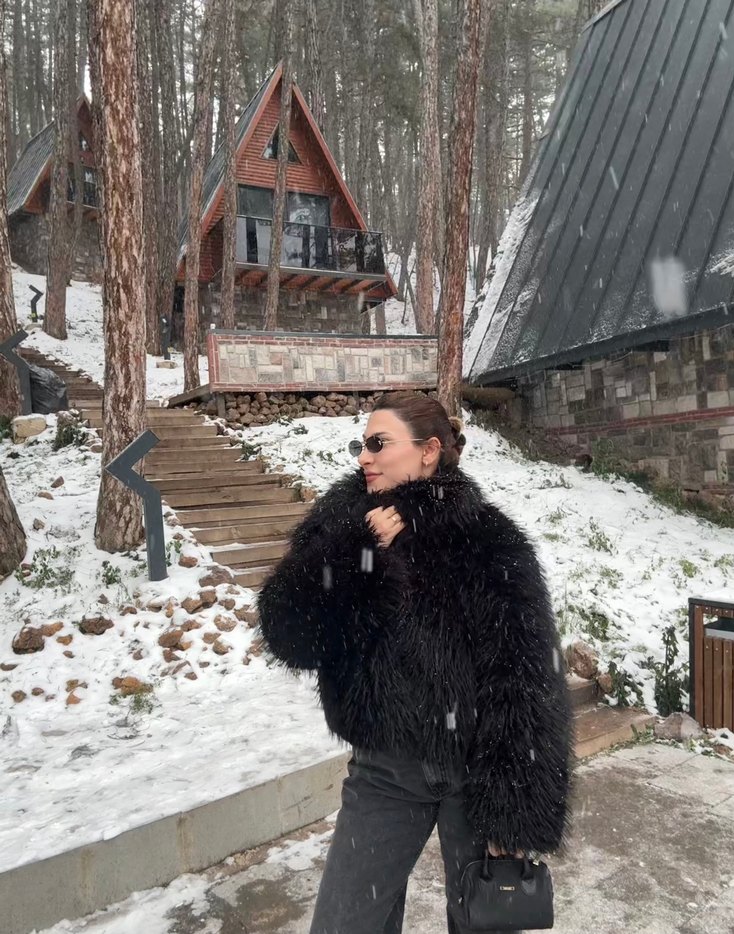siyah peluş kadın mont, uzun kollu ve yüksek yakalıdır. Rahat kesim ve midi boyda, yumuşak yünden üretilmiştir. Dış mekan kullanımı için uygundur.