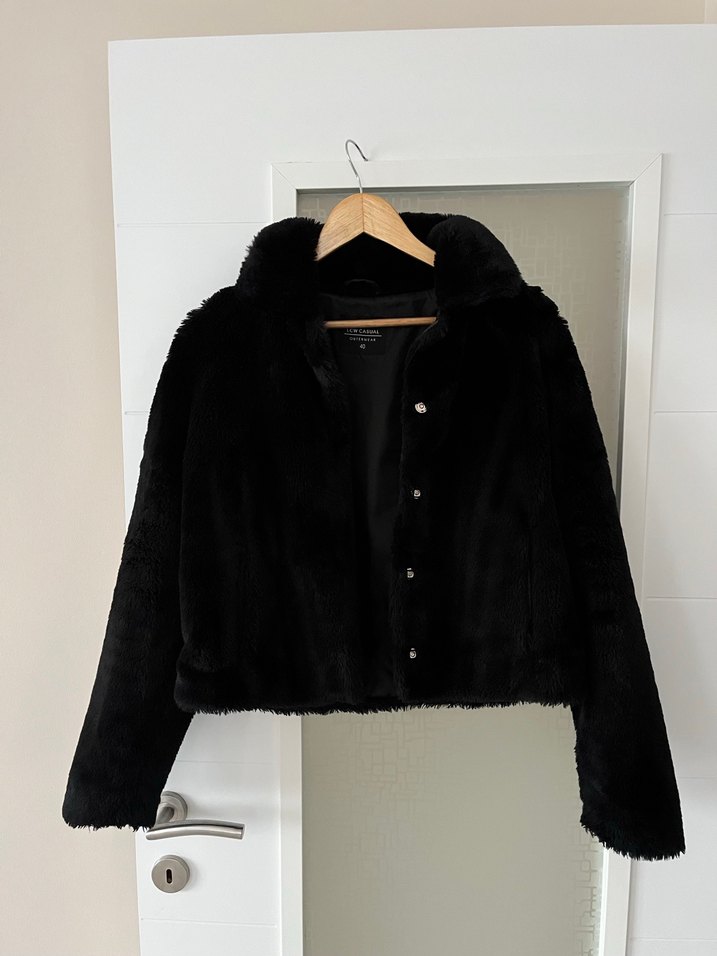 Siyah, kürk detaylı, uzun kollu ve yaka detaylı peluş mont. Normal midi boyda, fitted kesim ve goth tarzıyla günlük kullanıma uygundur. Çok sıcak tutuyor az kullanıldı