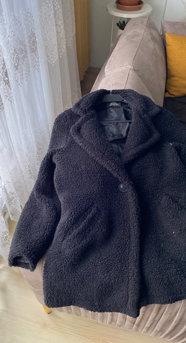 Siyah renkli, peluş kumaştan yapılmış, bol kesim uzun kollu kadın kaban. Kürk detaylı, notlu yaka ve midi boyda, rahat sokak stili için uygun.