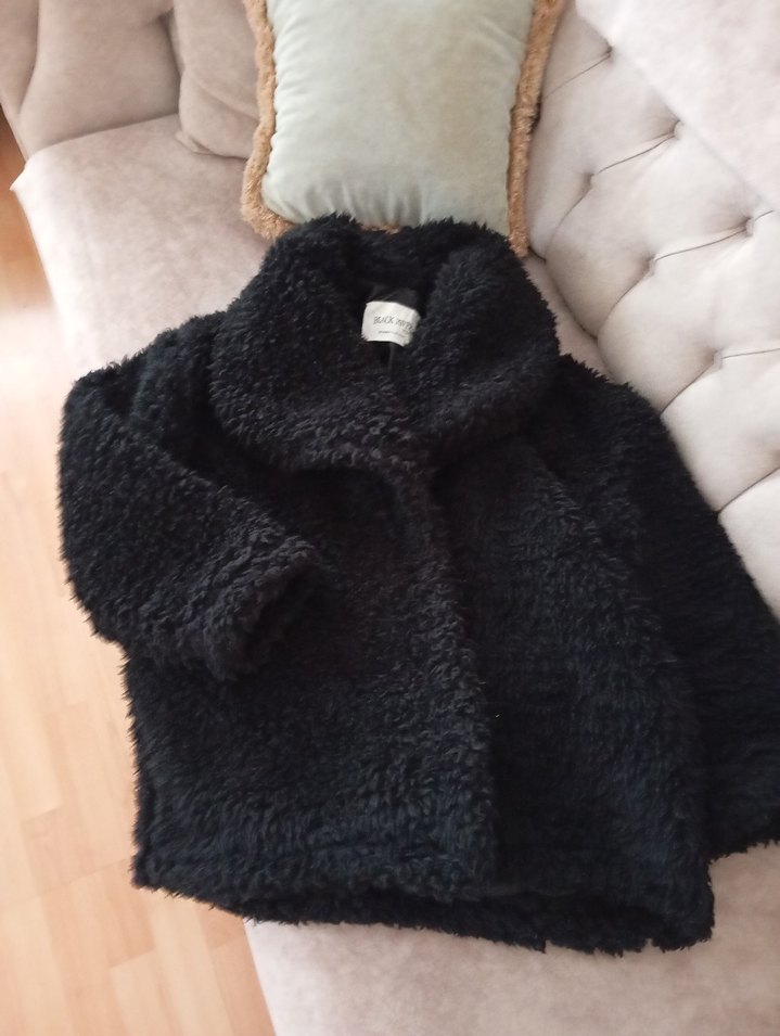 Siyah peluş kaban, uzun kollu ve kesik yaka detaylıdır. Rahat kalıp ve midi boyda, yumuşak kumaşıyla konfor sunar.