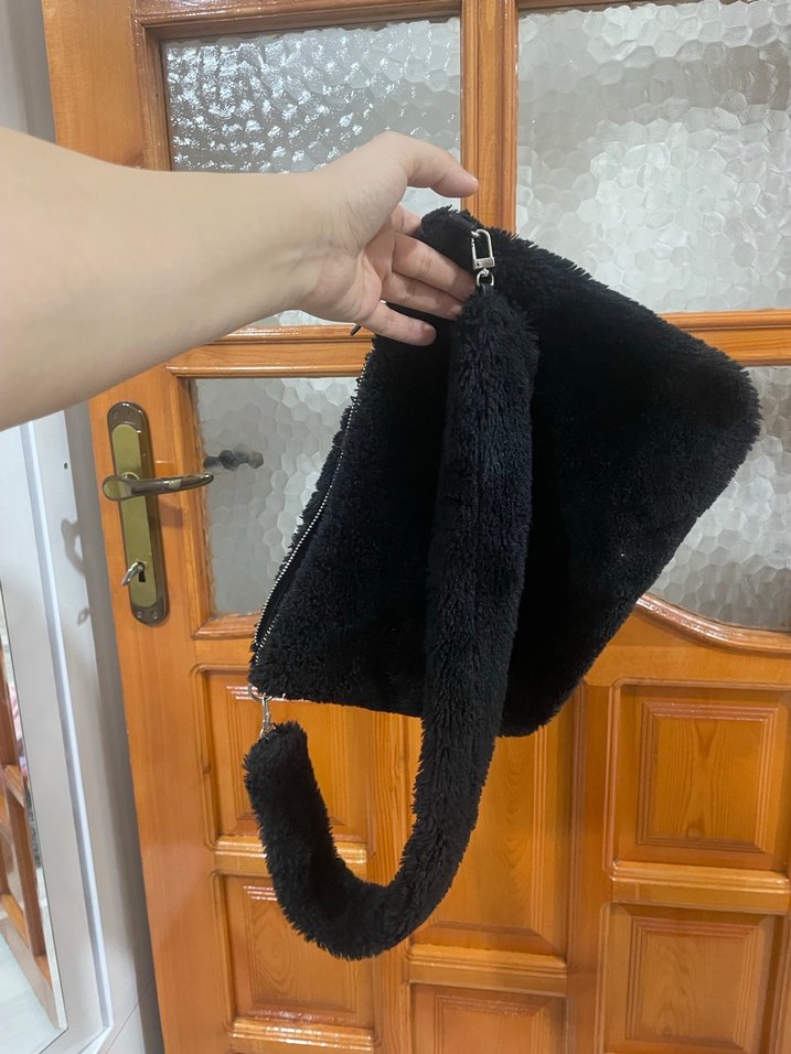 Siyah renkli, peluş detaylı ve yumuşak dokulu kadın omuz çantasıdır. Günlük sokak stili için uygun, desensiz ve rahat bir tasarıma sahiptir.