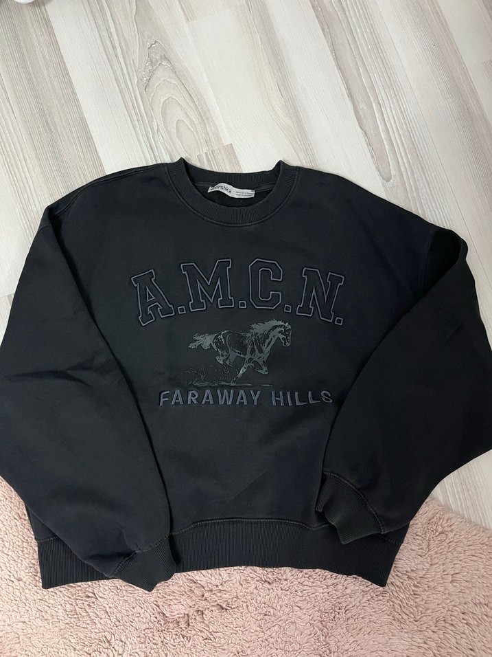 Siyah kadın sweatshirt, uzun kollu ve bisiklet yaka. A.M.C.N. ve Faraway Hills baskılı, yumuşak peluş kumaş ve kürk detaylıdır. Salaş kesim ve normal boyda, günlük sokak stili için uygundur.