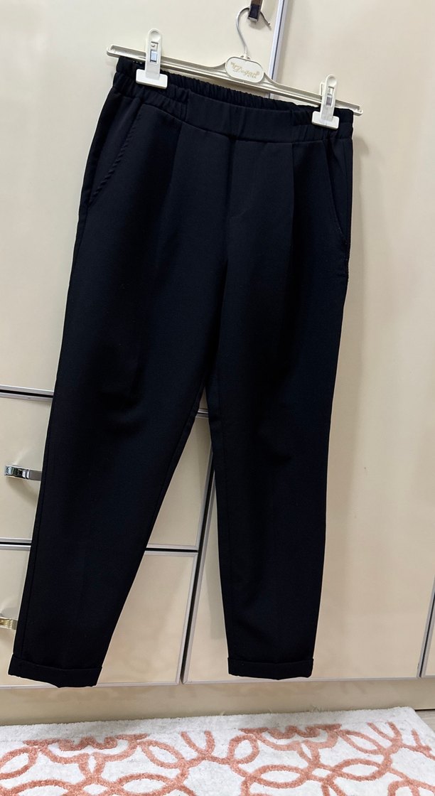 Siyah, pilili ve yan cepli kadın kumaş pantolon. Normal boy ve regular fit, ofis kullanımı için uygun, sentetik kumaştan üretilmiştir.