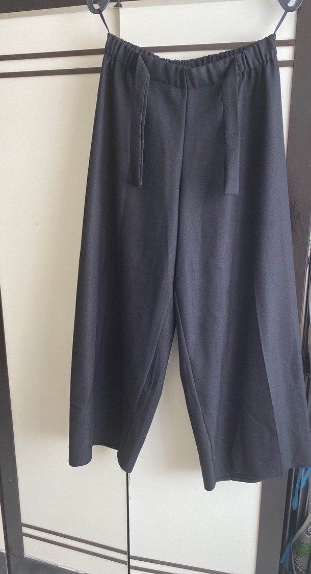 Uzun, bol kesim siyah renkli, piliseli kadın kumaş pantolon