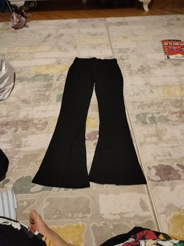Siyah, piliseli detaylı, sentetik kumaştan yapılmış, vücuda oturan ispanyol paça pantolon. Günlük rahat sokak stili için uygundur.
