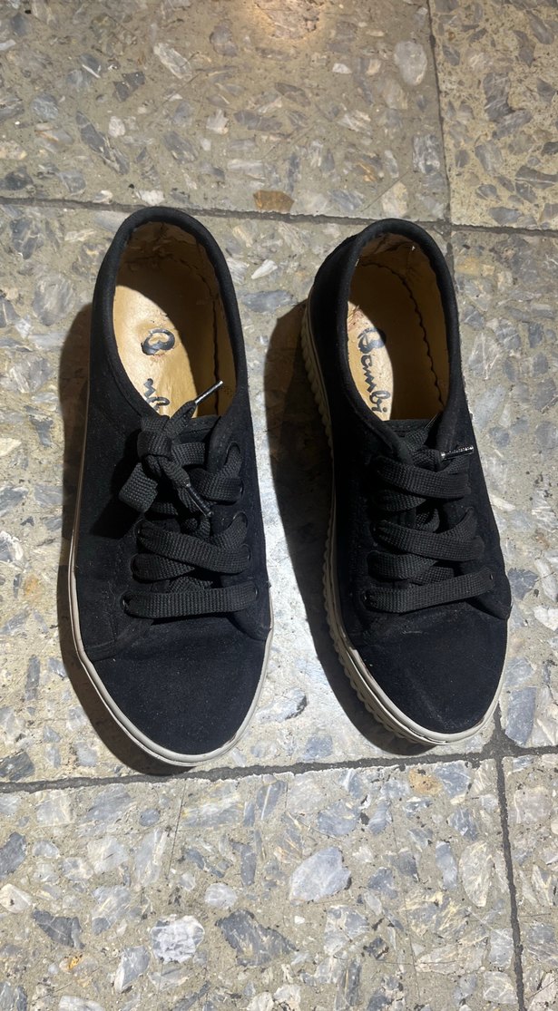 Siyah renkte, kauçuk malzemeden yapılmış platform topuklu kadın spor ayakkabısı. Normcore tarzıyla günlük kullanıma uygun, zahmetsiz şıklık sunar. Platform kısmı 2 parmak yüksekliğinde. İyi durumda fakat iç tarafta topuk kısmında ve tabanda aşınmalar var. Fotoğraflarda görünüyor.