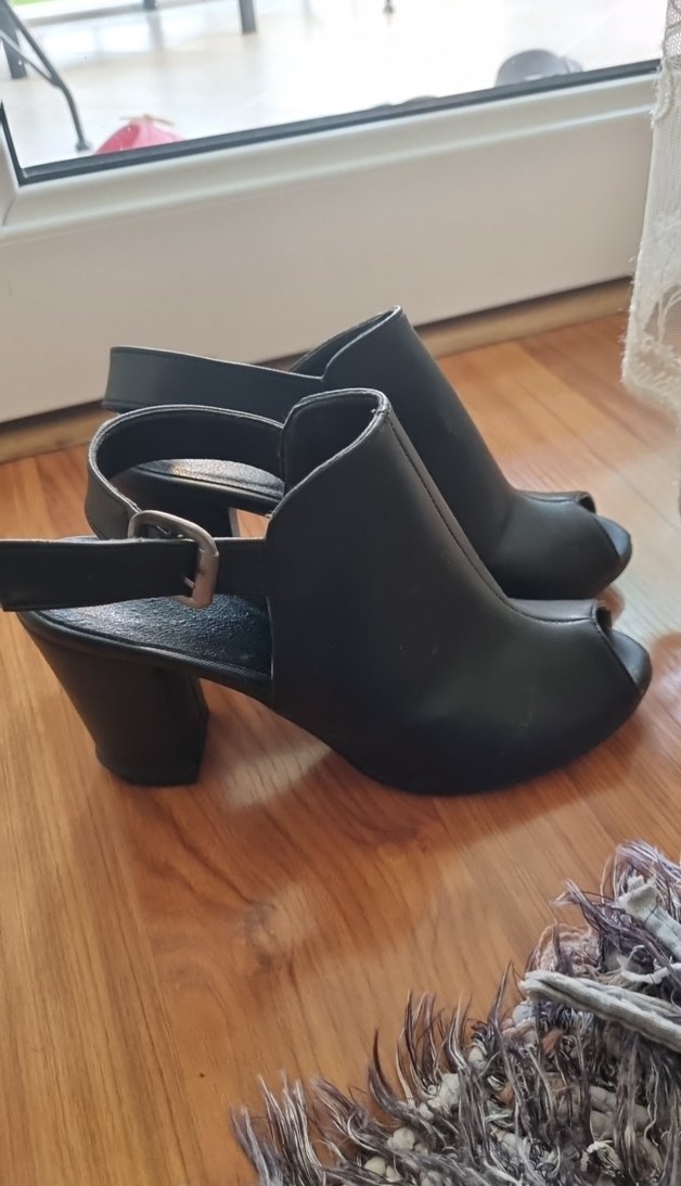 Siyah, tok topuklu ve tokalı kayışlı kadın platform topuklu ayakkabılar. Kauçuk malzemeden yapılmış, minimalist gotik tarza uygun, günlük kullanıma elverişli.