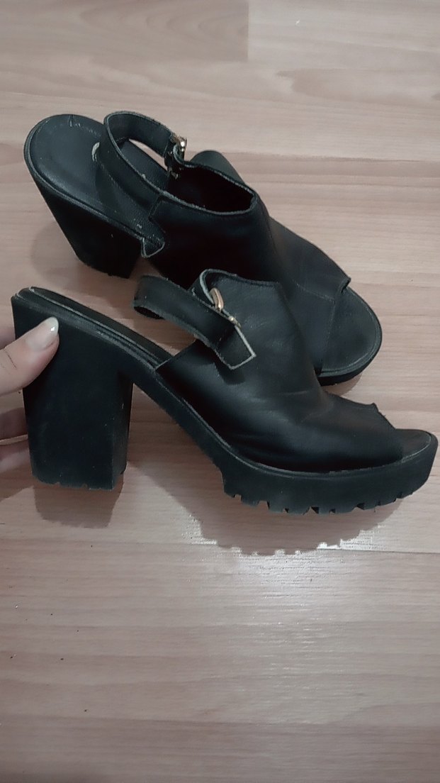 Siyah, tok topuklu ve tokalı bantlı platform ayakkabılar. Lastik malzemeden üretilmiş, cesur ve minimalist goth tarzda, günlük kullanıma uygun.