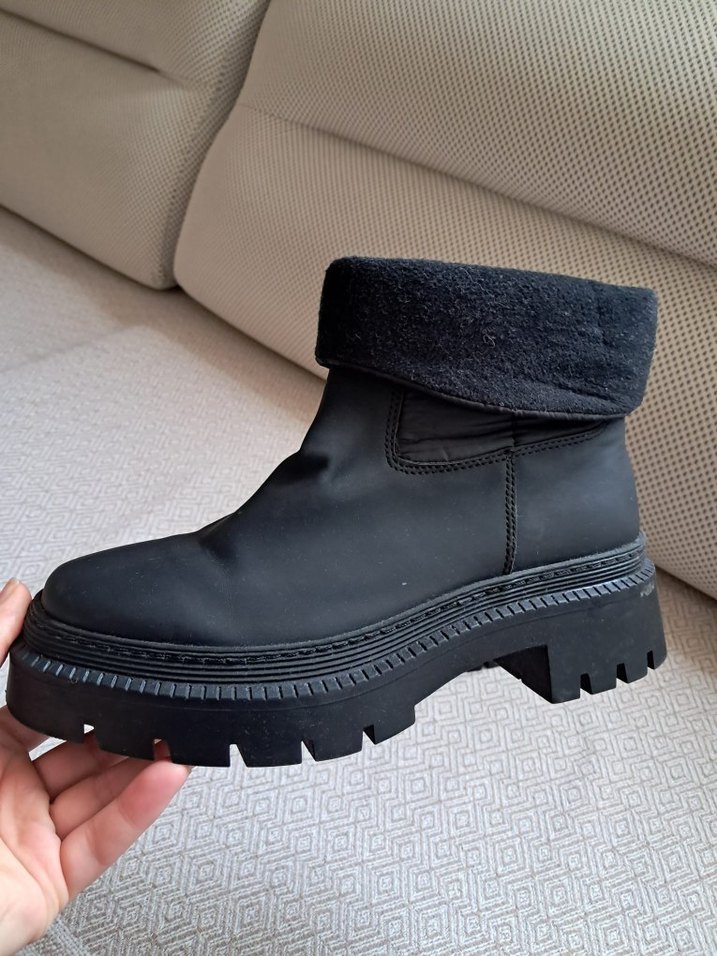 Siyah kauçuk tabanlı, platform topuklu kadın botları, yumuşak katlanabilir. İki üç defa dışında giyilmedi. Son fotoğraflarda gözüken katlanma izi poşette durmasından dolayı.