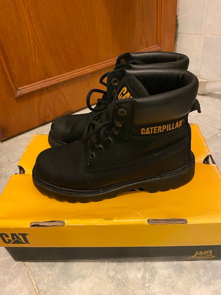 Caterpillar markalı, siyah kauçuk malzemeden kadın platform topuklu botlar. Tokalı detaylarıyla spor ve sokak tarzına uygun.