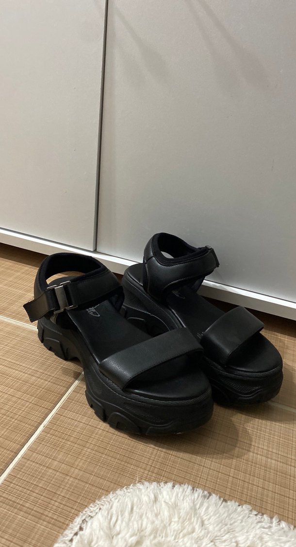 Siyah renkte, tokalı bantlı, kauçuk malzemeden yapılmış kadın platform topuklu sandalet. Minimalist gotik tarzıyla günlük kullanıma uygundur.