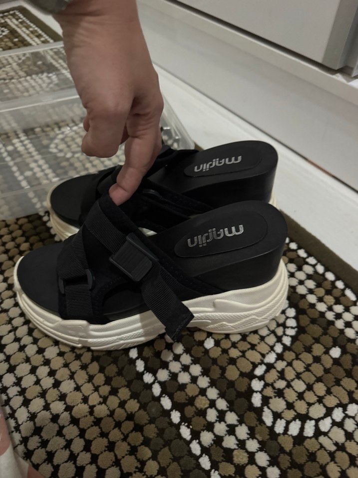 Neredeyse hiç giyilmedi. Ayarlanabilir tokalı kayışlara sahip siyah platform topuklu sandalet, trend sokak giyimi için. Kauçuk malzemeden günlük konfor sağlar.