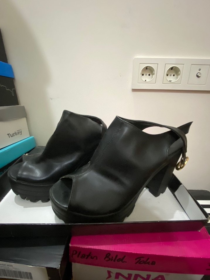 Siyah, kalın topuklu, tokalı platformlu kadın ayakkabısı. Minimalist gotik tarzda, günlük kullanım için uygun.