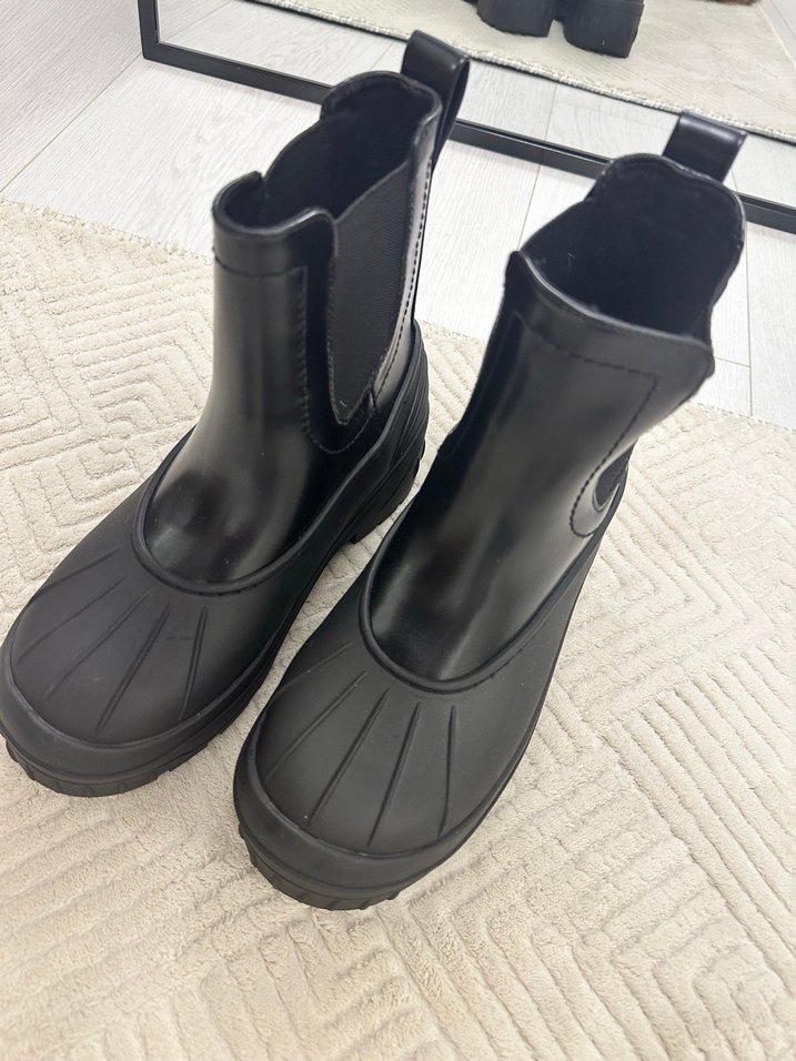 Siyah lastik kadın botları, platform topuklu ve kemerli tasarımlı, trend sokak giyimi için uygun minimal ve desensiz stil.