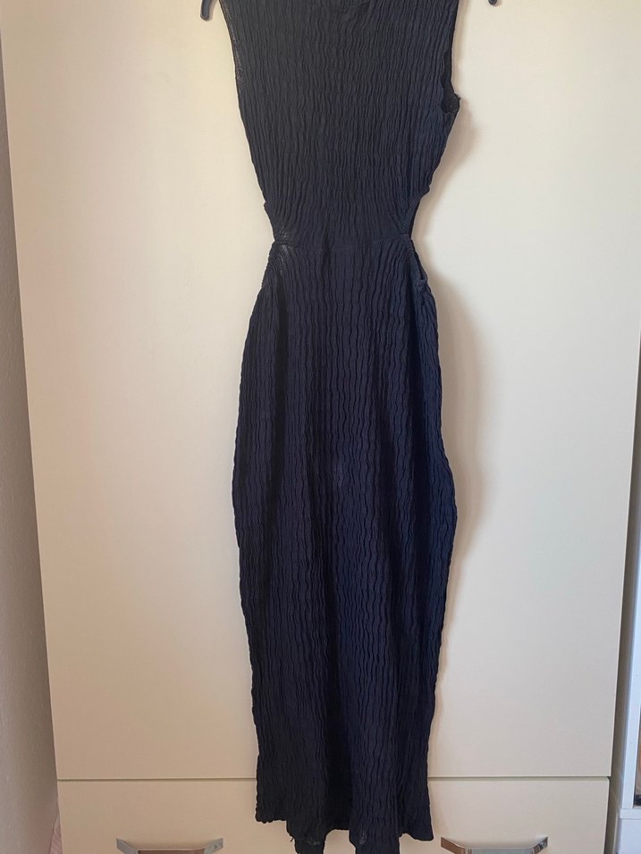 Lacivert renkli, keten kumaştan yapılmış, pliseli ve v yaka detaylı uzun elbise. Strappy kollu ve vücuda oturan kesimiyle ofis için uygun goth tarzında.