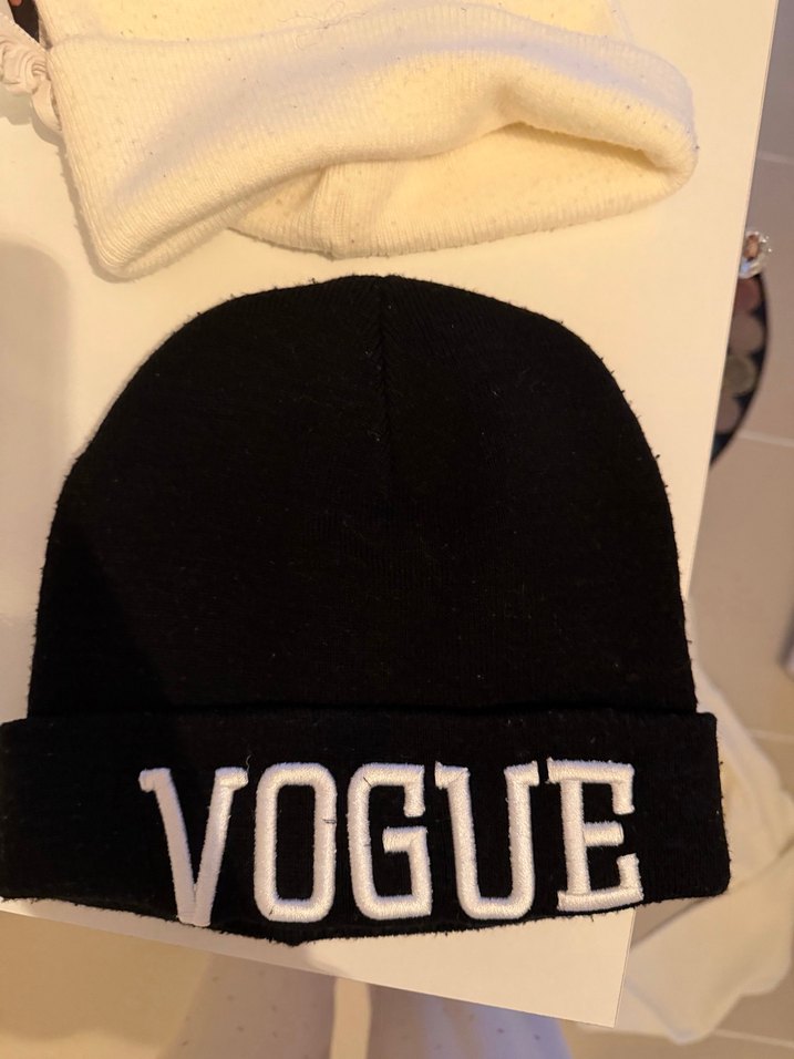 Siyah polar kadına özel bere, VOGUE nakışlı ve cırt cırtlı detaylı, sokak stili ve rahatlığı bir arada sunar.