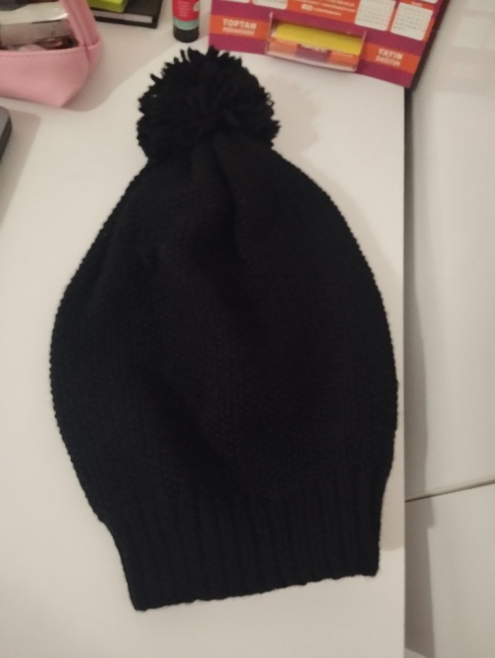 Yumuşak fleece astarlı, ponponlu siyah triko bere, rahat ve sade gotik tarzda.