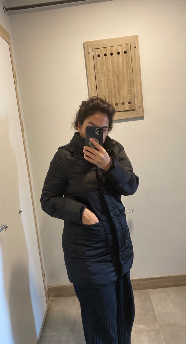 Siyah kadın kışlık mont, dar kesim ve normal boyda. Notlu yaka ve uzun kollu, şişme detaylı, yumuşak ve sıcak kumaştan üretilmiştir.