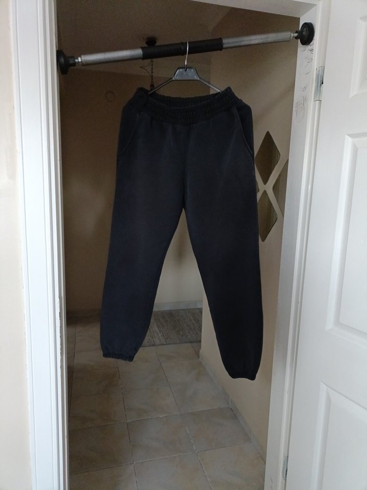 Siyah, rahat kesim, yumuşak ve sıcak kumaştan midi boy kadın eşofman altı. Spor ve günlük stil için sade ve desensiz tasarım.