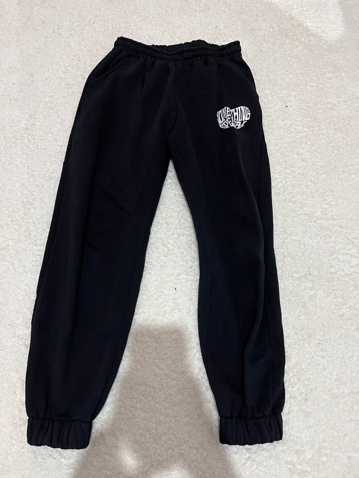 Siyah, bol kesim, elastik bel ve manşetli, yumuşak ve sıcak kumaştan yapılmış kadın eşofman altı, dış mekan rahat kullanıma uygun.
