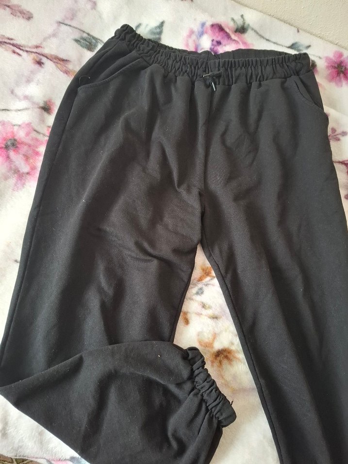 Yumuşak sentetik kumaştan, belinde bağcıklı, siyah rahat kesim kadın eşofman altı, gündelik kullanım için uygun.