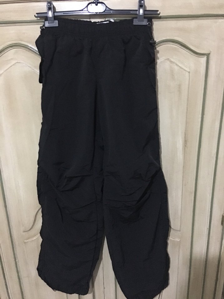 Siyah, rahat kesim, kadın pantolon. Midi boy ve sentetik kumaş. Sokak tarzına uygun, günlük dış mekan kullanımı için ideal. Paraşüt kumaş bel lastikli ayarlanabilir lastikli paça lastikli ayarlanabilir boy 100 cm iade yoktur