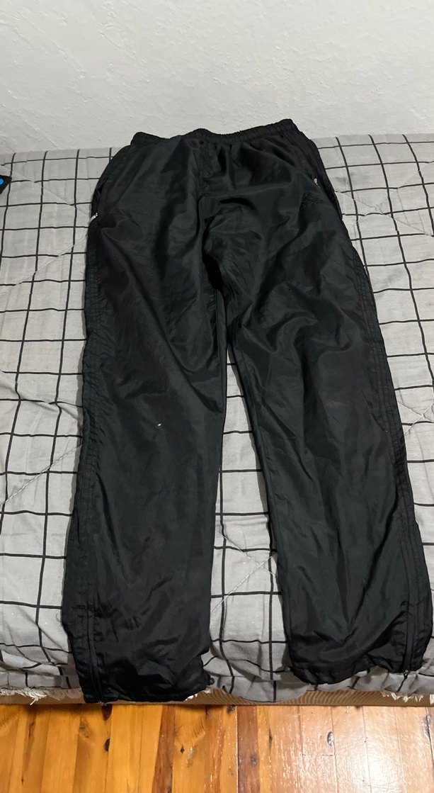 Siyah, sentetik kumaştan yapılmış, fermuarlı cepleri olan kadınlar için rahat kesim sokak stili pantolon. Rahat ve şık, dış mekan kullanımı için uygun.