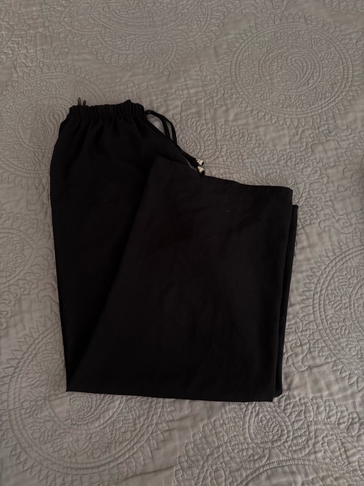 Siyah, salaş kesim, uzun kadın pantolonu. Minimalist ve rahat sokak stili, günlük kullanıma uygun, zahmetsiz şıklık sunar. Defosu yoktur standart Beli lastikldır