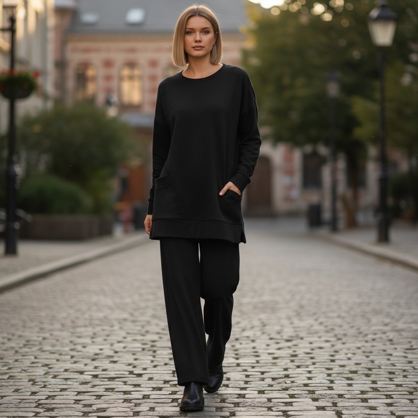 1 ve 2 bedenli renkleri var Salaş kesim, uzun kollu siyah kadın eşofman takımı, yumuşak ve sıcak kumaştan. Günlük rahat kullanım için uygun, sokak stilinde.