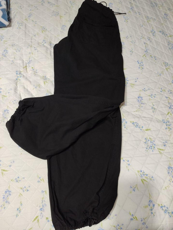 Siyah, salaş kesim, uzun boy, dökümlü tasarımlı kadın kumaş pantolon, yumuşak sentetik kumaştan günlük kullanım için uygun.