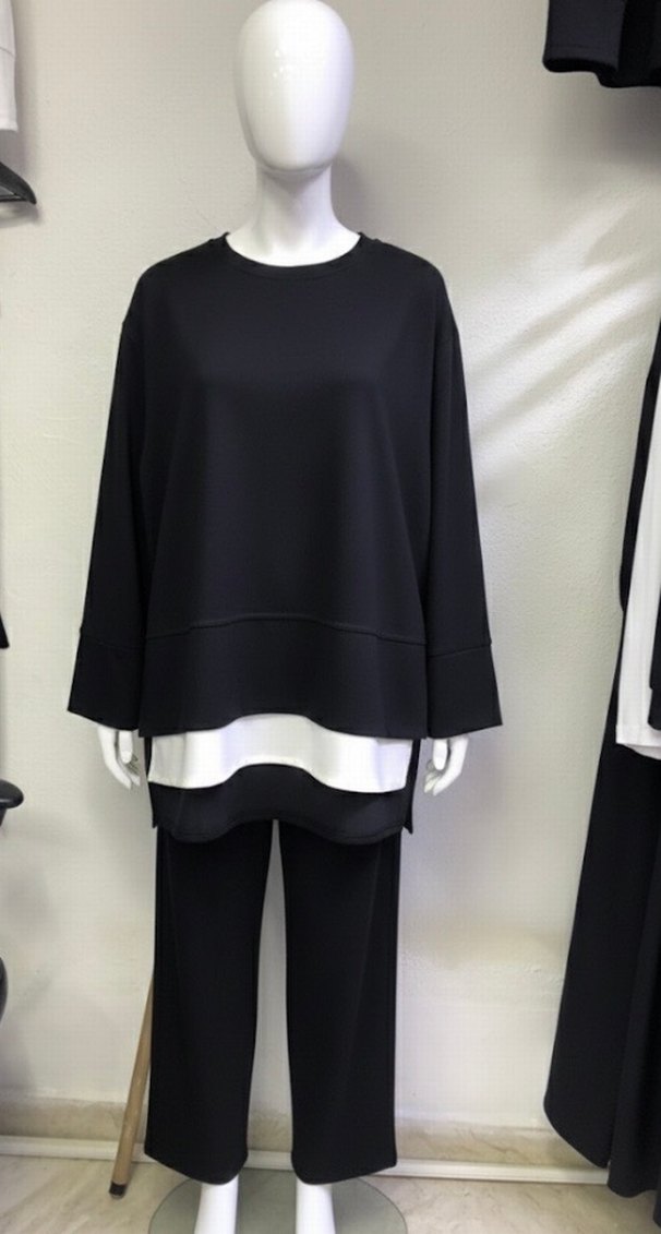 Siyah, salaş kesim uzun kollu, bisiklet yaka kadın tunik. Midi boyda, düz desensiz ve sentetik kumaştan. Minimalist tarzda, günlük kullanıma uygun şık ve rahat.