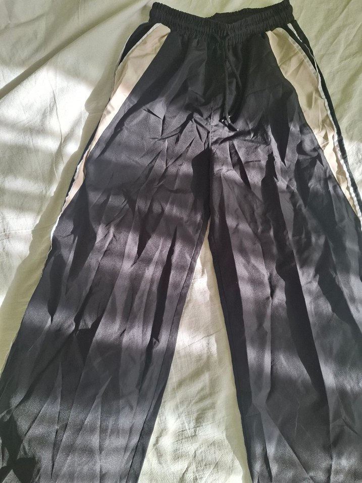 Siyah , salaş kesim ve drapeli uzun kadın pantolonu. Sokak stili ve dış mekan kullanımı için uygun, spor athleisure tarzında.