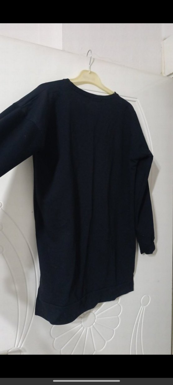 Bu siyah kadın sweatshirtü yuvarlak yaka ve uzun kollu, salaş kesim ve normal midi boydadır. Pürüzsüz sentetik kumaştan üretilmiş olup, günlük rahat kullanıma uygun zahmetsiz şıklık sunar.