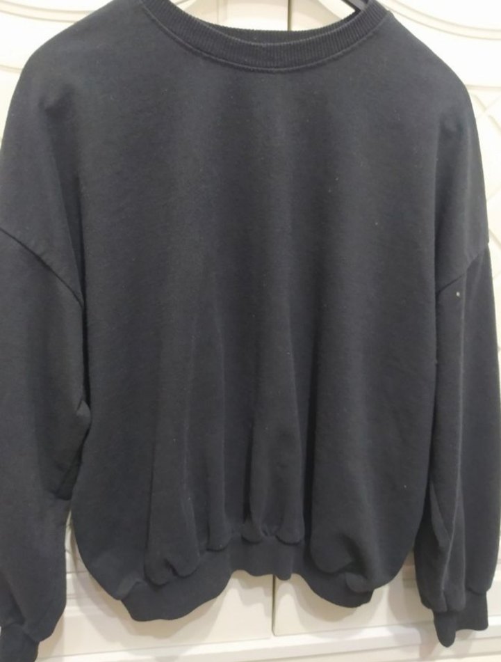 Siyah renkli, yuvarlak yaka ve uzun kollu kadın sweatshirtü, rahat salaş kesime sahiptir. Yumuşak sentetik kumaştan üretilmiş, günlük kullanıma uygun gündelik tarzda bir üründür.